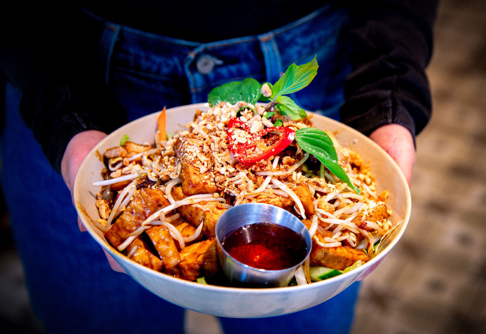 med kyckling, biff eller tofu
